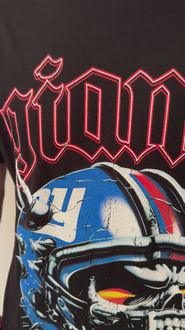 This t-shirt features a bold skeleton skull rocking the New York Giants helmet, complete with a rugged worn effect that gives it a vintage, battle-tested vibe. This design combines grit, style, and attitude.